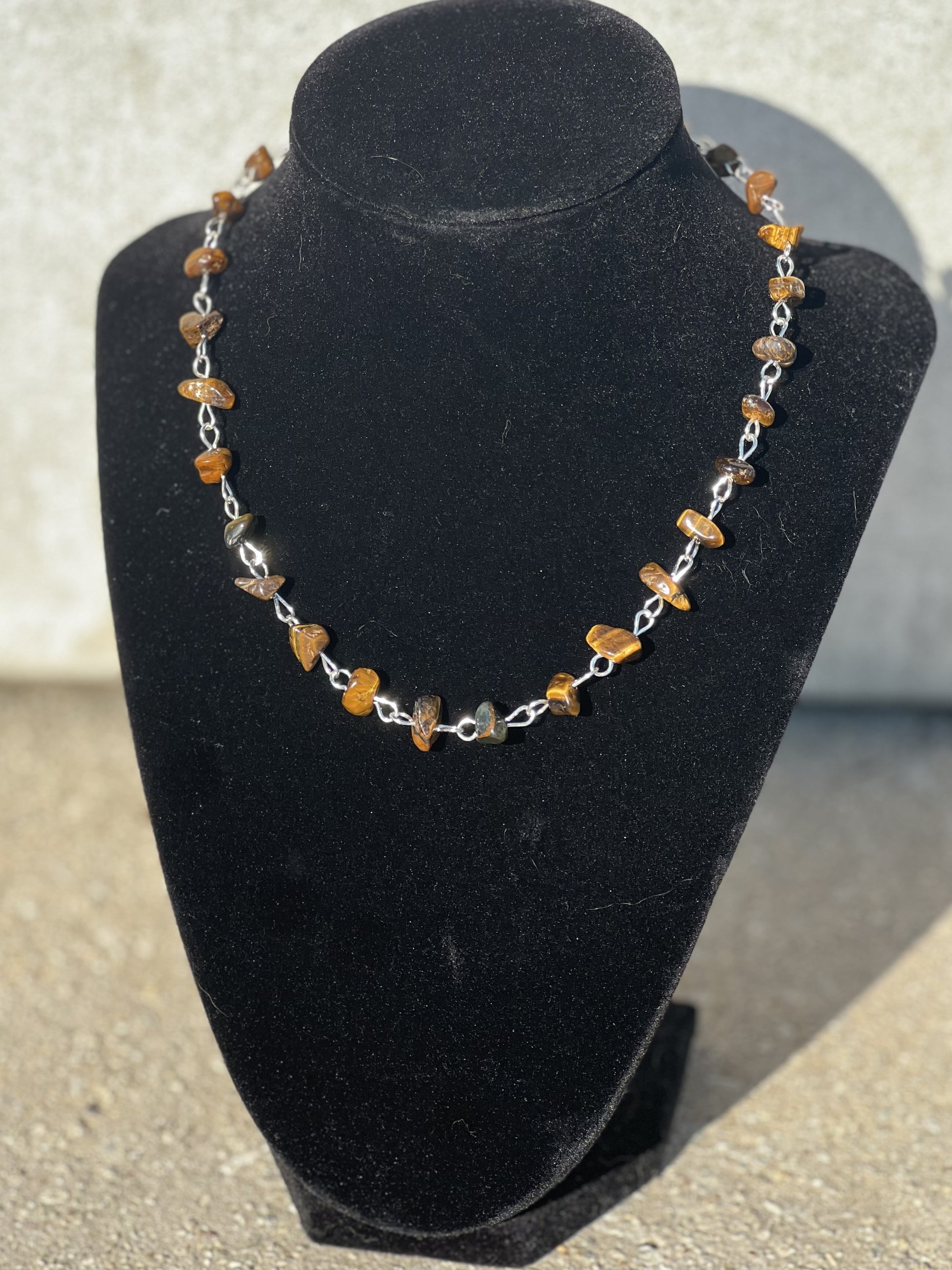 This 16in necklace is handcrafted with German silver and tiger eye crystal inspire beads. Each necklace is handmade with one-of-a-kind beadery and shaping.